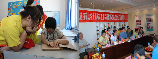 通过与盲童学生们的学习交流,社会实践服务团的队员们了解了盲童教育的现状,深刻意识到了关注盲童教育工作的重要性。活动最后,队员们号召社会各界人士奉献爱心,为贫困盲童捐献善款,给他们带来知识和光明的希望。