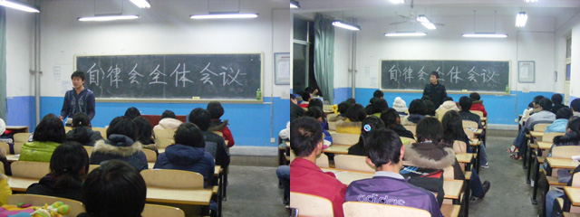 会议首先由各部部长对近期工作进行了总结发言,并对干事们的积极表现给与了高度评价。自律会主席费志通发表讲话并重点强调:作为自律会成员,必须要先律己后律人,才能树立自律会的威信,利于成人成事;近段时间要特别加强学生宿舍的卫生检查力度,督促宿舍经常开窗透气、宿舍垃圾及时清理等。确保每一位同学养成良好的卫生习惯,严防甲流。最后,自律会成员们分组交流心得。会议在融洽的气氛中圆满结束。