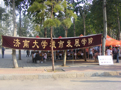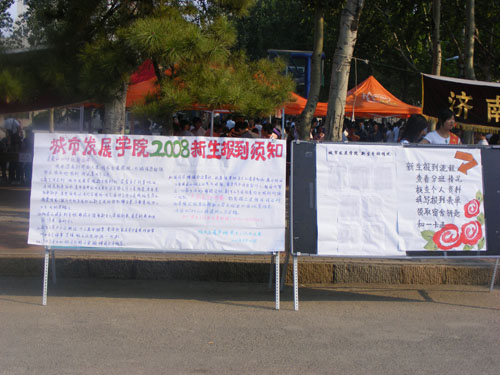 在济南大学东校区的篮球场前,“济南大学城市发展学院”的横幅格外显眼,2008级的大一新生们在亲友的陪同下,陆续来到了报到处,各班级的代班们耐心的为他们办理者报到手续,热情的为他们讲解新生注意事项。校园里呈现着欢迎新生的热闹景象,学院的领导也顶着夏日烈日细心的解答了每一个新生的问题。校门口,学院安排的学生会成员们早已等待多时,他们热情的为新生们提行李,将他们送到报到地点。自律会成员们则负责维持现场新生报到的秩序,而新生们也很自觉地排队等待报到。顺利报到的同学则在各位学长的带领下安排住宿情况。新生们的脸上各个洋溢着灿烂的笑容,他们可能是在憧憬着即将到来的大学生活,他们的大学生活也将从今天正式开始。这美丽的校园也会因为他们的到来而更加美丽,更加多彩。