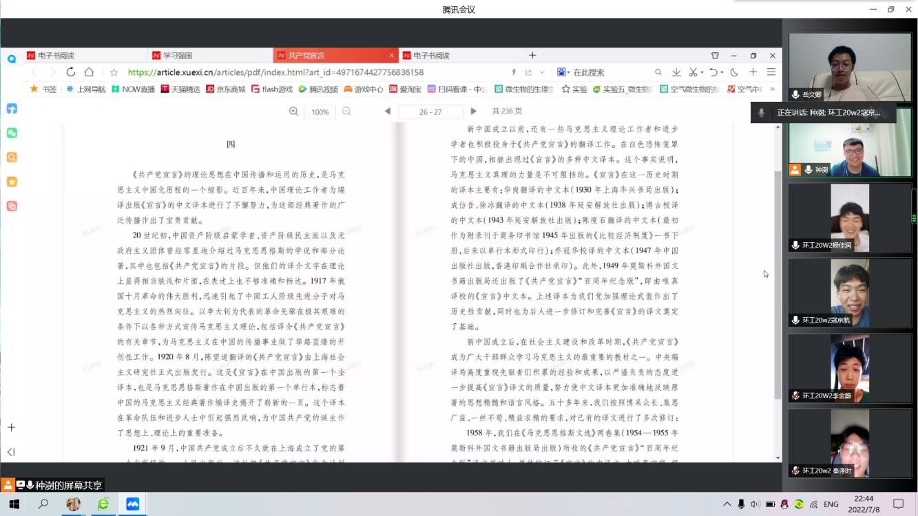 suncitygroup太阳新城“青年党史研学社”暑期社会实践团队由指导老师白健和种澍、岳文卿、秦逢时、寇京航、李金蔚、臧少凡、李冰语、杨佳润、张心悦九名成员组成。此次实践活动旨在提高当代青年的科学文化素质,深刻学习党艰苦卓绝的发展历史。本次实践活动主要采取线上腾讯会议的方式进行,团队成员通过观看相关视频学习探讨党的发展历程,同时研究学习习近平谈治国理政、毛泽东选集、列宁选集、马克思恩格斯合集、共产党宣言、“九二共识”会谈记录等相关文章和书籍,通过生动的文字更加深刻体会中国共产党党曲折而漫长探索之路。